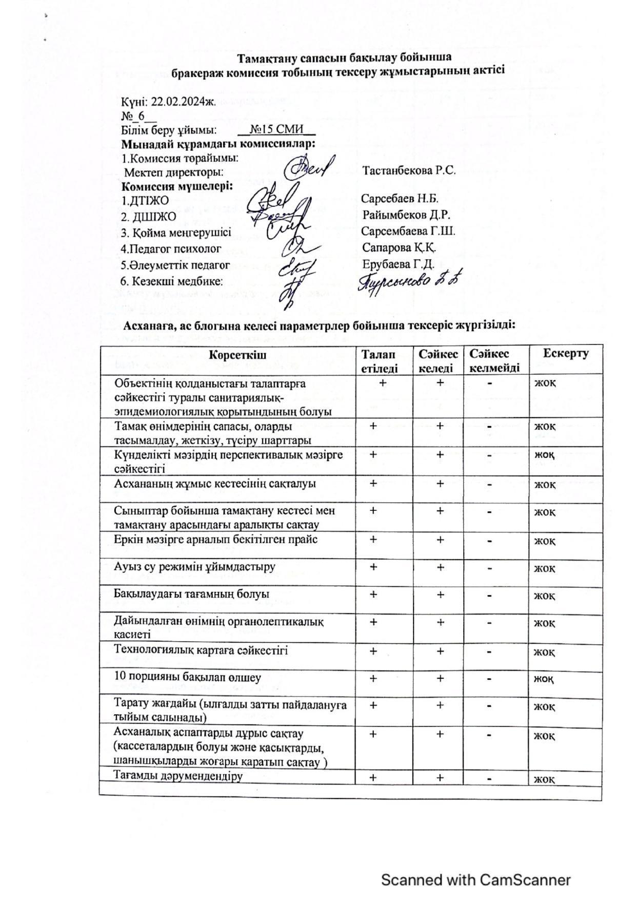 27 февраль 2024 0 1 2 3 4 5 Ақпан айының мектеп асханасына тамақтандырудың сапасына мониторинг жүргізу (бракеражды комиссиясы) АКТісі