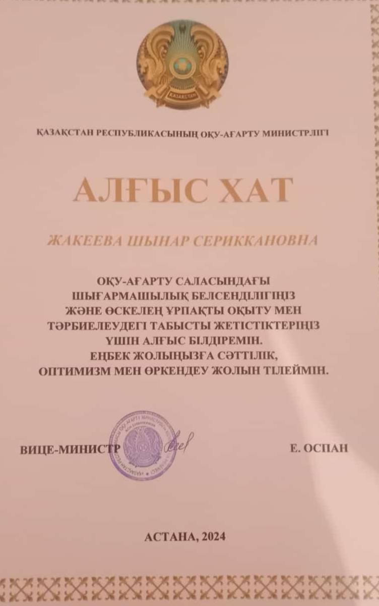 Оқу-ағарту саласындағы шығармашылық белсенділігі және өскелең ұрпақты оқыту мен тәрбиелеудегі табысты еңбегі үшін мектеп-интернат кітапханашысы ЖАКЕЕВА ШЫНАР СЕРИККАНОВНА вице-министр Е.Оспанның алғыс хатымен марапатталды. Құттықтаймыз 👏👏