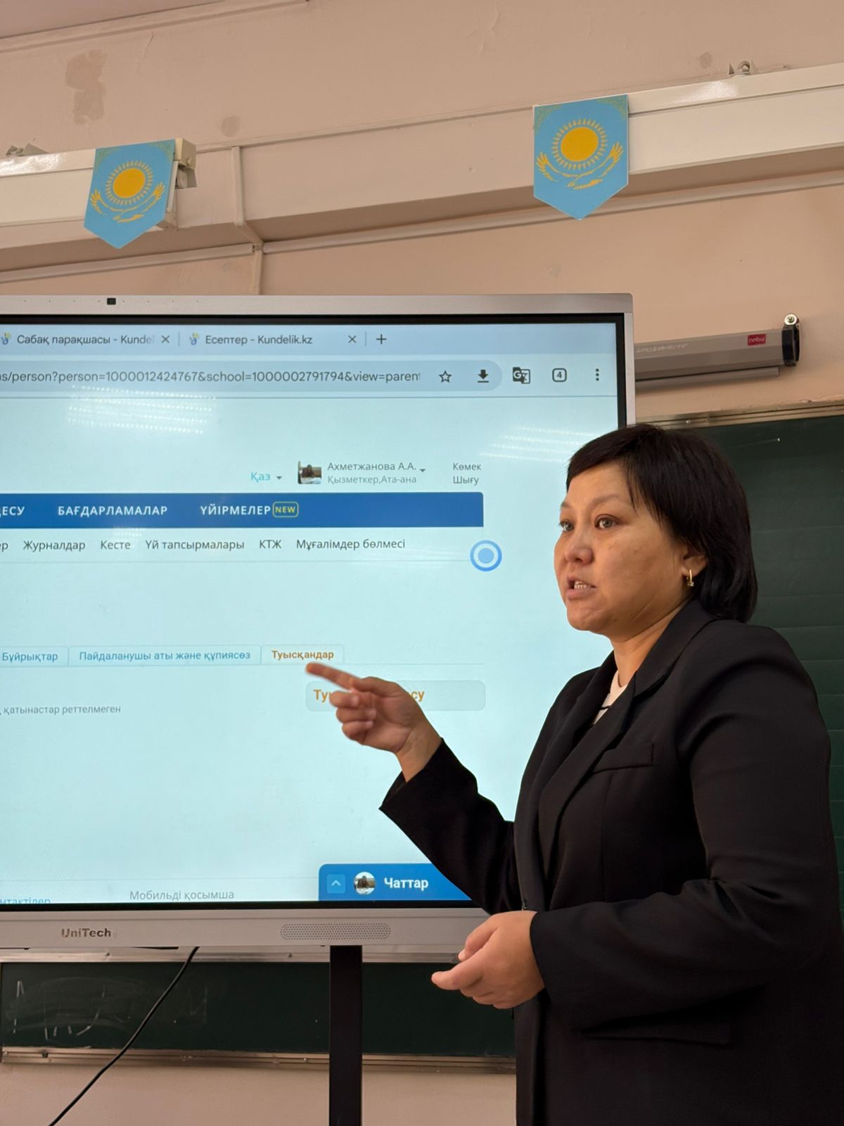 В ходе занятия были подробно рассмотрены вопросы эффективного использования электронной системы Kundelik.kz: работа с электронным журналом, выставление оценок, отметка посещаемости, внесение домашних заданий, работа с календарно-тематическим планированием, а также пути повышения цифровой компетентности педагогов.