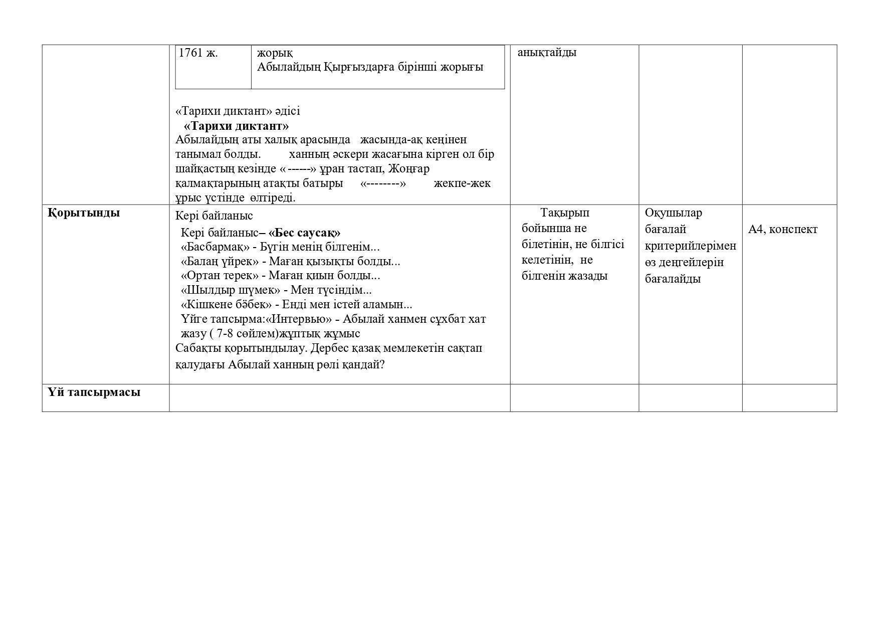 Кері байланыс жасалып, оқушылар сабаққа қызығушылықпен қатысты. Бағалау алдарында ілінген тақтада жауап беру деңгейлеріне қарай бағаланды.