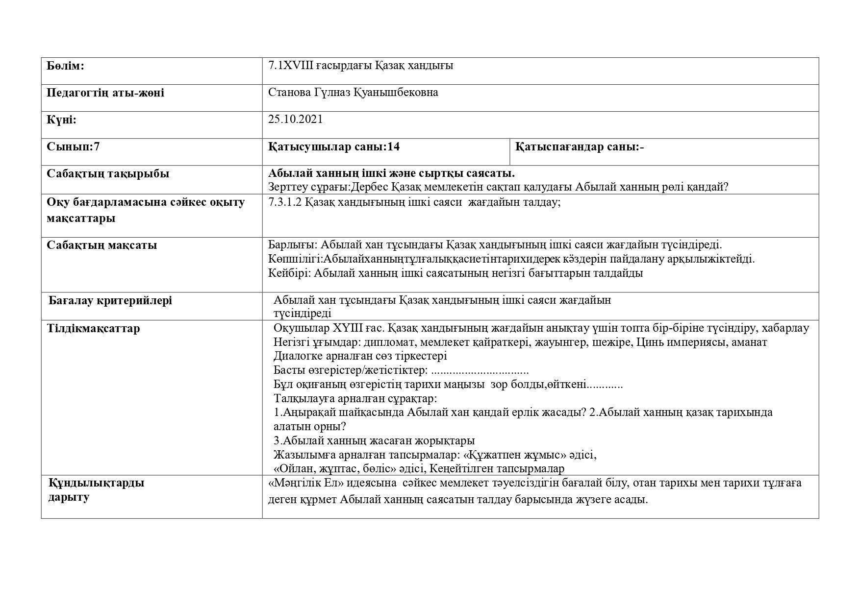 Пәні: Қазақстан тарихы, пән мұғалімі Станова Г. Қ.
