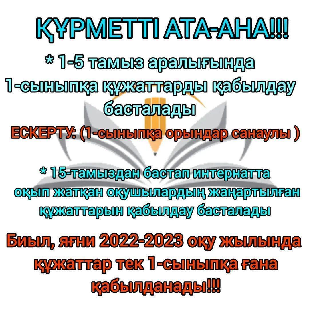 1-тамыздан бастап, 1-сыныпқа құжаттар қабылданады. Орындар санаулы(15-орын).